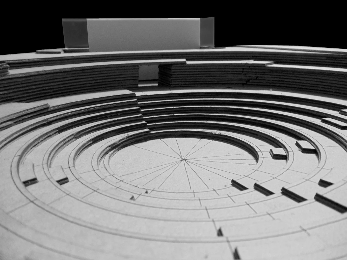 The exploration of Stirling’s signature graphic representation strives to isolate Stirling’s signature line: the curve juxtaposed agains a straight line. The specific proportions of Stirling’s curves create incredibly compelling compositions. Infused with program and structure, the two dimensional lines enable emergence of equally compelling spaces that can be inhabited. These specific curvatures represent freed, ribbon-like curtain glass walls spanning around rigid cores inclosing semi-private spaces of civic nature. The iconic curve of Stirling’s glazing emerges from two composite curves: one derived from tangent circles with one of a radius twice in size then the other and second – with two circles of specific proportions pulled apart by tripling the R distance.